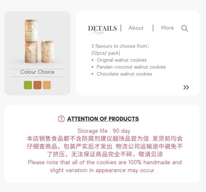 | VARIANT | Original Walnut Cookies 原味奶油, Pandan Coconut Walnut Cookies 斑斓椰丝, Chocolate Walnut Cookies 浓香可可 |