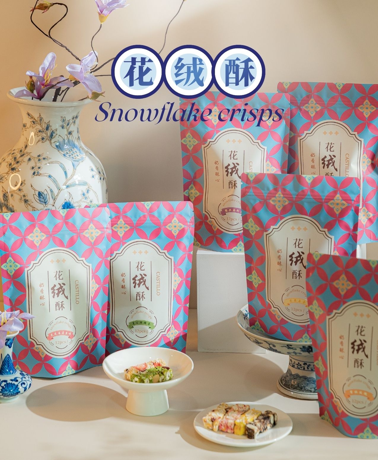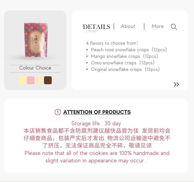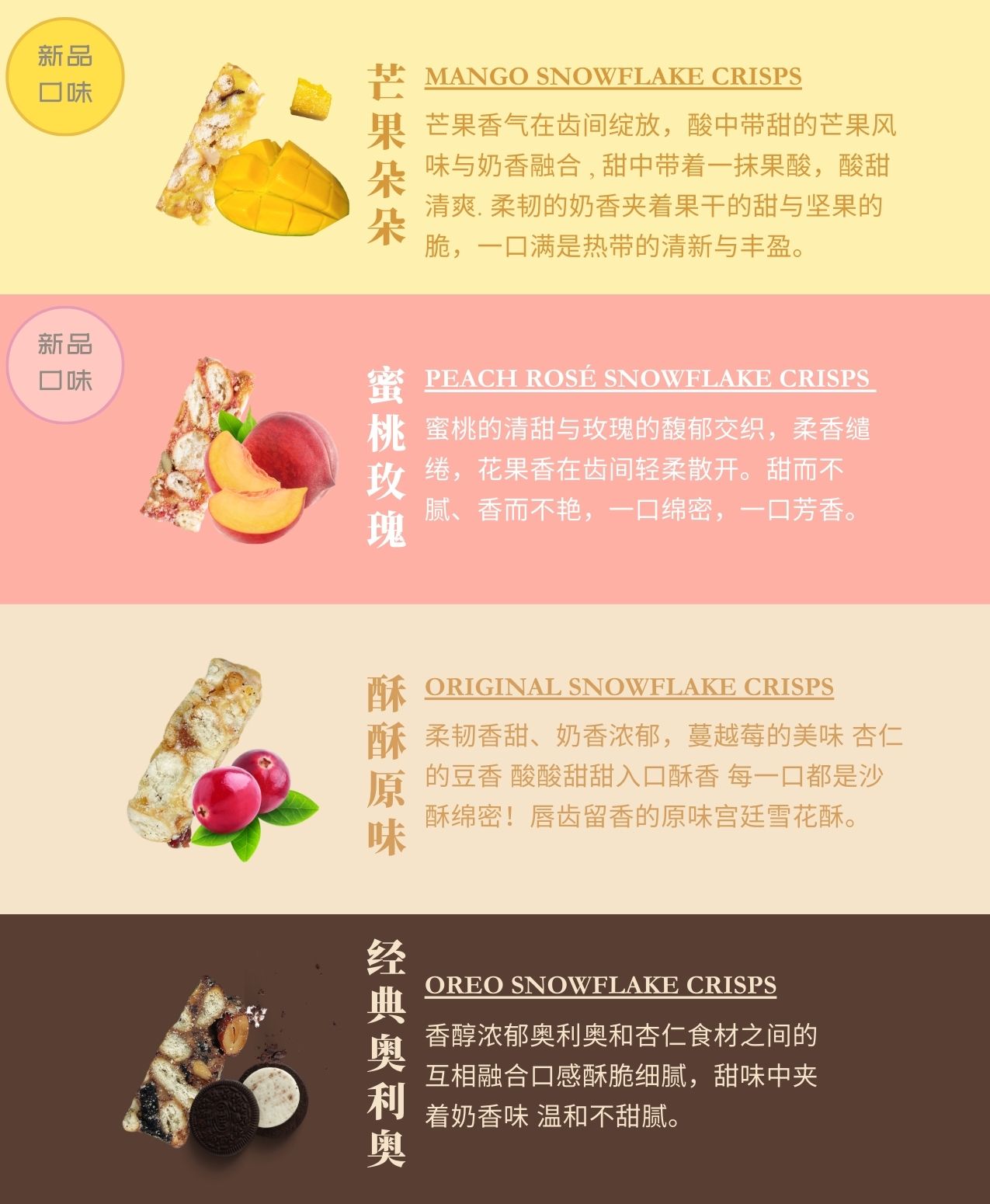 Original Snowflake Crisps 酥酥原味, Oreo Snowflake Crisps 经典奥利奥, Mango Snowflake Crisps 芒果多多, Peach Rose Snowflake Crisps 蜜桃玫瑰